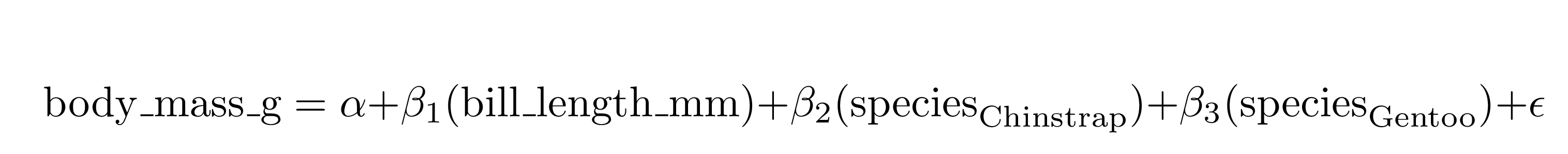 #> \operatorname{body\_mass\_g} = \alpha + \beta_{1}(\operatorname{bill\_length\_mm}) + \beta_{2}(\operatorname{species}_{\operatorname{Chinstrap}}) + \beta_{3}(\operatorname{species}_{\operatorname{Gentoo}}) + \epsilon