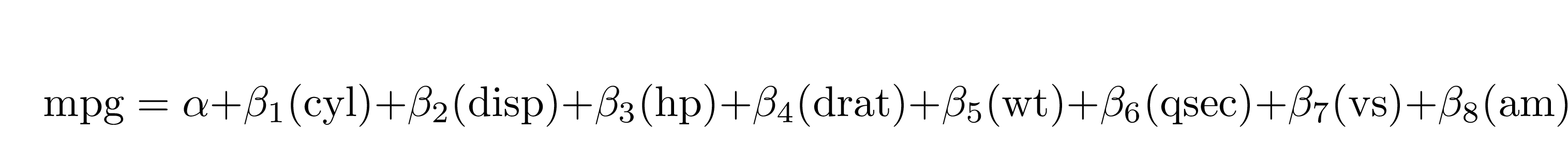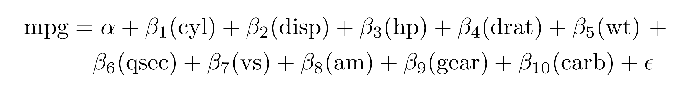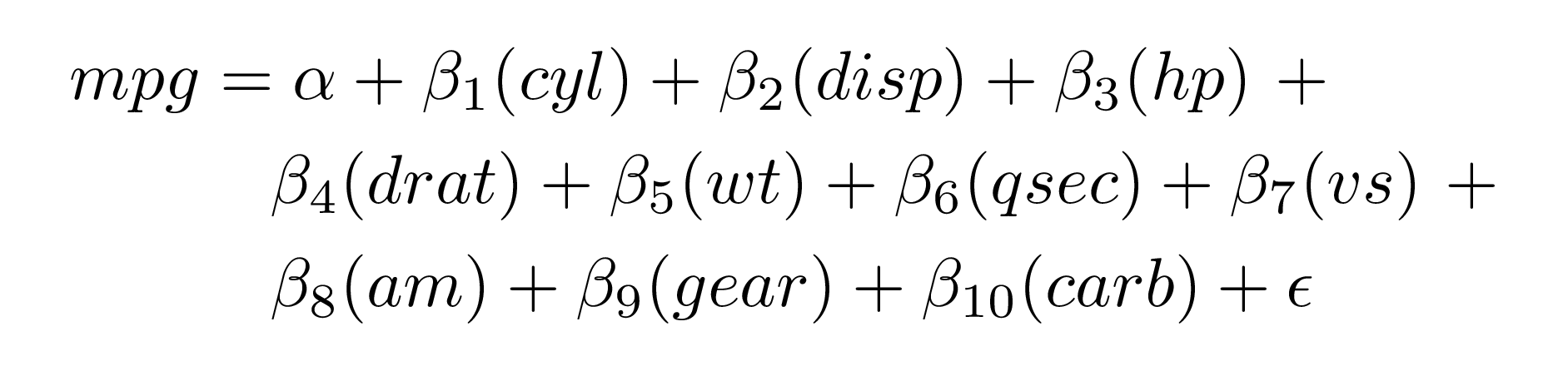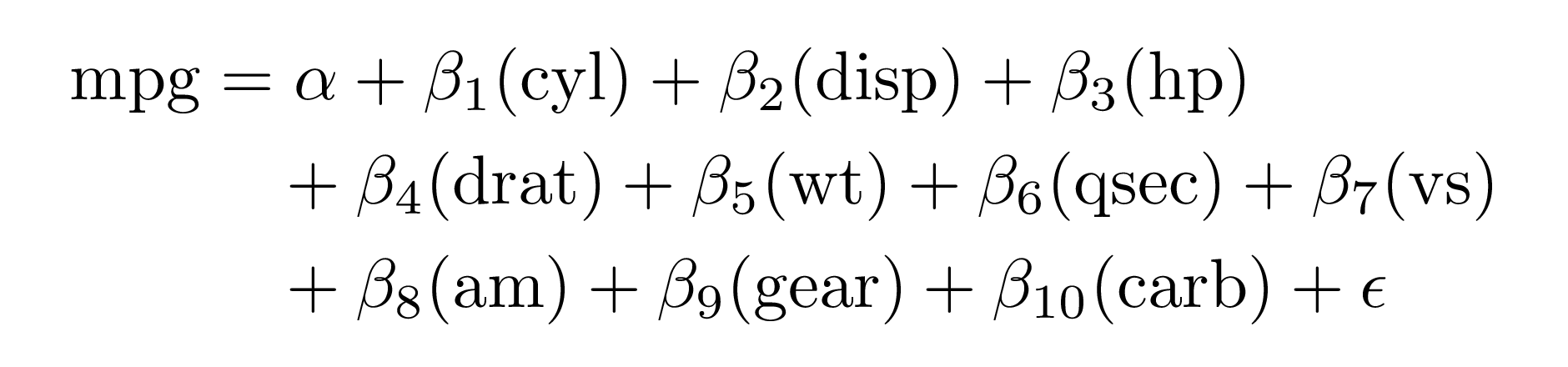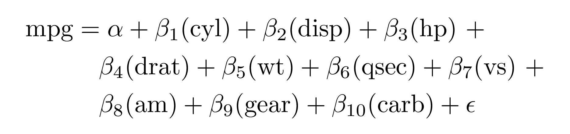 #> \operatorname{mpg} = \alpha + \beta_{1}(\operatorname{cyl}) + \beta_{2}(\operatorname{disp}) + \beta_{3}(\operatorname{hp}) + \beta_{4}(\operatorname{drat}) + \beta_{5}(\operatorname{wt}) + \beta_{6}(\operatorname{qsec}) + \beta_{7}(\operatorname{vs}) + \beta_{8}(\operatorname{am}) + \beta_{9}(\operatorname{gear}) + \beta_{10}(\operatorname{carb}) + \epsilon