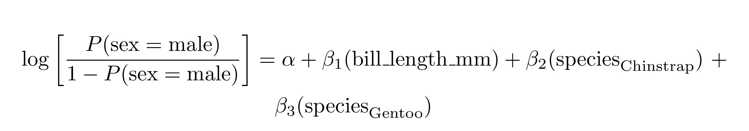 #> \log\left[ \frac { P( \operatorname{sex} = \operatorname{male} ) }{ 1 - P( \operatorname{sex} = \operatorname{male} ) } \right] &= \alpha + \beta_{1}(\operatorname{bill\_length\_mm}) + \beta_{2}(\operatorname{species}_{\operatorname{Chinstrap}})\ + \\