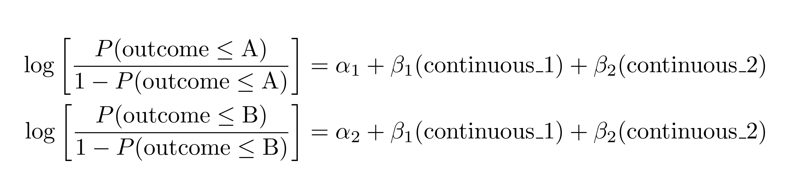 \[ \begin{aligned} \log\left[ \frac { P( \operatorname{outcome} \leq \operatorname{A} ) }{ 1 - P( \operatorname{outcome} \leq \operatorname{A} ) } \right] &= \alpha_{1} + \beta_{1}(\operatorname{continuous\_1}) + \beta_{2}(\operatorname{continuous\_2}) \\ \log\left[ \frac { P( \operatorname{outcome} \leq \operatorname{B} ) }{ 1 - P( \operatorname{outcome} \leq \operatorname{B} ) } \right] &= \alpha_{2} + \beta_{1}(\operatorname{continuous\_1}) + \beta_{2}(\operatorname{continuous\_2}) \end{aligned} \]