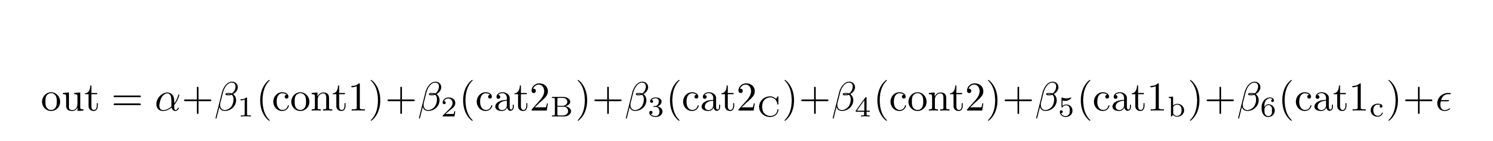 #> \operatorname{out} = \alpha + \beta_{1}(\operatorname{cont1}) + \beta_{2}(\operatorname{cat2}_{\operatorname{B}}) + \beta_{3}(\operatorname{cat2}_{\operatorname{C}}) + \beta_{4}(\operatorname{cont2}) + \beta_{5}(\operatorname{cat1}_{\operatorname{b}}) + \beta_{6}(\operatorname{cat1}_{\operatorname{c}}) + \epsilon