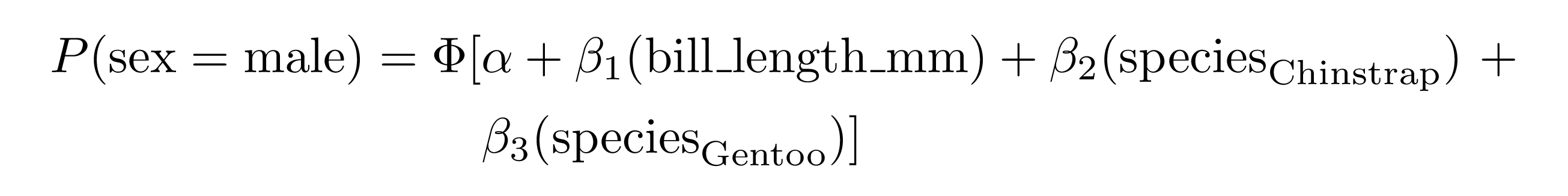 #> P( \operatorname{sex} = \operatorname{male} ) &= \Phi[\alpha + \beta_{1}(\operatorname{bill\_length\_mm}) + \beta_{2}(\operatorname{species}_{\operatorname{Chinstrap}})\ + \\