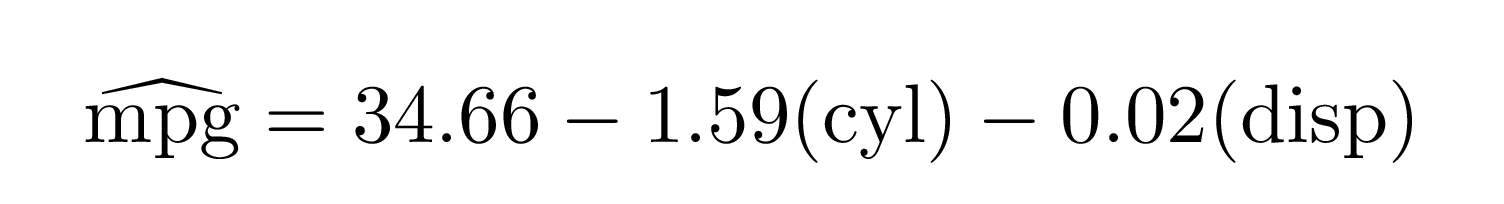 #> \operatorname{\widehat{mpg}} = 34.66 + -1.59(\operatorname{cyl}) + -0.02(\operatorname{disp})