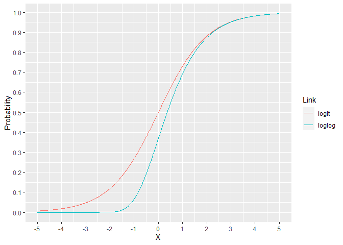 For the binomial family, the link is usually the logit but there are other options. The loglog model assigns a lower probability for X ranging from -5 to 2. For X over 2, the models are essentially indistinguishable. This can lead to improved performance when the response rate is much lower than 50%.