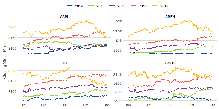 line_plot(gafa_stock, "Date", c("Closing Stock Price" = "Close"),