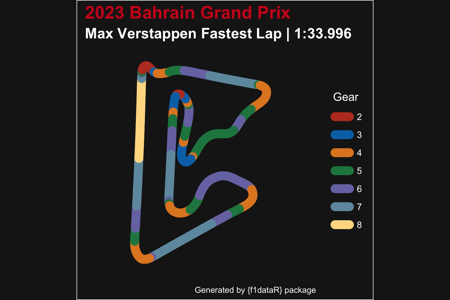 plot_fastest(season = 2023, round = 1, session = "R", driver = "VER", color = "gear")