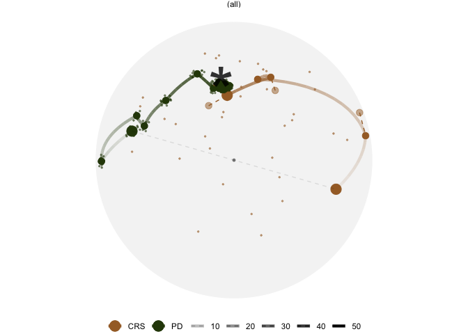 Different optimisers can be compared by plotting their projection bases on the reduced PCA space. Here holes_1d_geo is the data obtained from the same PP problem as holes_1d_better introduced above, but with a search_geodesic optimiser. The 5 \(\times\) 1 bases from the two datasets are first reduced to 2D via PCA, and then plotted to the PCA space. (PP bases are ortho-normal and the space for \(n \times 1\) bases is an \(n\)-d sphere, hence a circle when projected into 2D.)