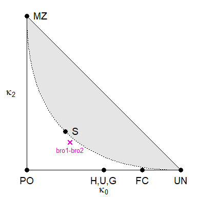 Reassuringly, the estimate is close to the theoretical expectation for non-inbred full siblings, \((\kappa_0, \kappa_1, \kappa_2) = (0.25, 0.5, 0.25)\), corresponding to the point marked S in the triangle.