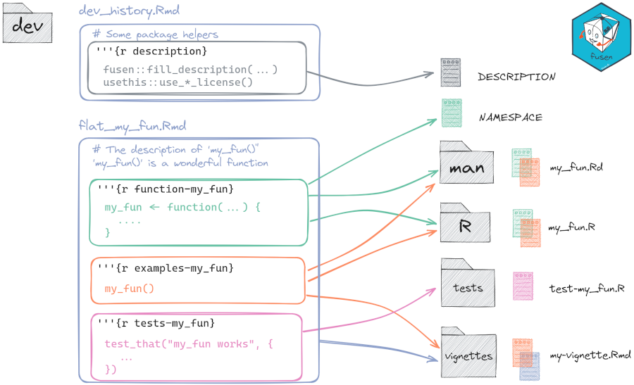 Indeed, when you write a Rmarkdown file (or a vignette), you create a documentation for your analysis (or package). When you write some functions, you check your functions with examples and you maybe write some unit tests to verify the outputs. This is even more true if you follow this guide : ‘Rmd first’: When development starts with documentation Write them all in the same file while you explore the possibilities and let {fusen} store them in the right place for you!