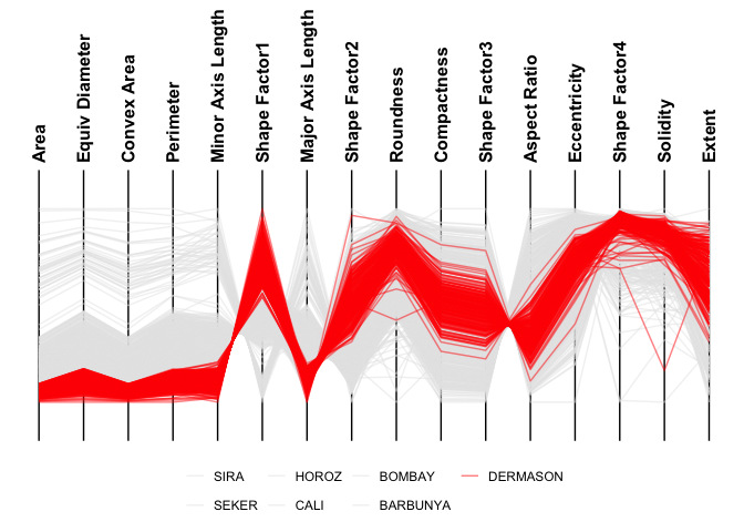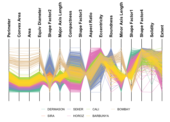 For datasets with many observations and mostly numeric features, parallel coordinate plots may be more appropriate.