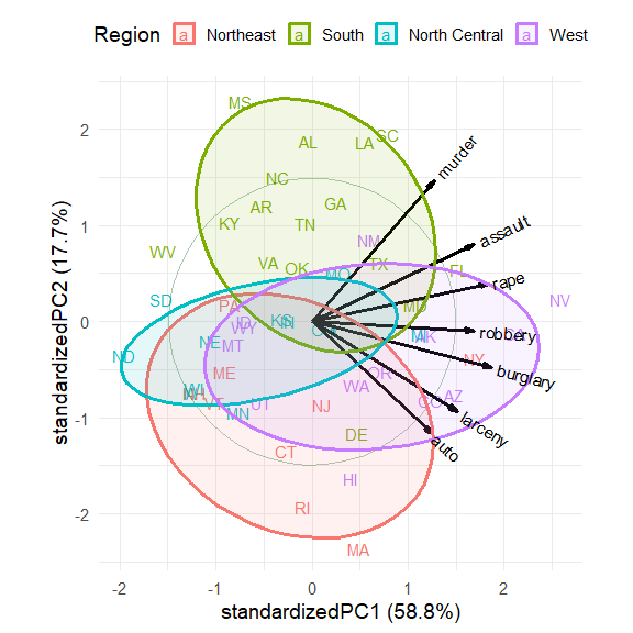The regions are represented by the differences in the centers of the data ellipses for the scores. Southern states are highest on murder, assault and rape, while the Northeast states are highest on auto theft and larceny.