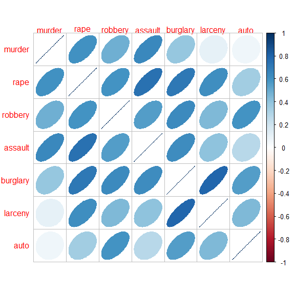 The correlations are all positive. Note also that the variables in the dataset are ordered in seriousness or violence, ranging from murder to auto theft.