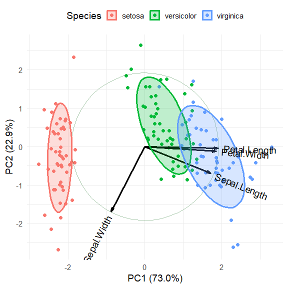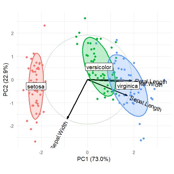 with extended functionality for labeling groups, drawing a correlation circle, and adding data ellipsoids. It also supports PCA-like objects calculated by FactoMineR::PCA()
