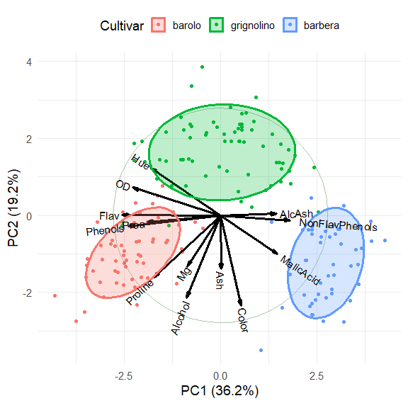 The three cultivars are arranged along the first dimension, in the order barolo < grignolino < barbera. These are distinguished largely by a contrast between (Phenols