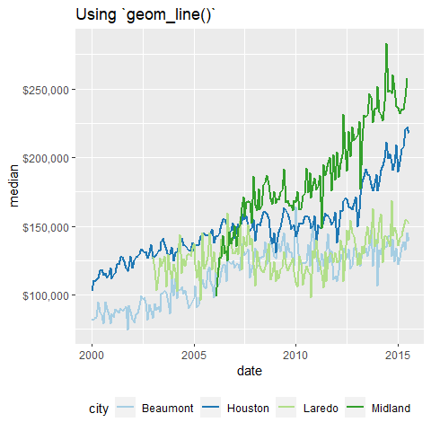 p + geom_line(linewidth = 1) + ggtitle("Using `geom_line()`") p