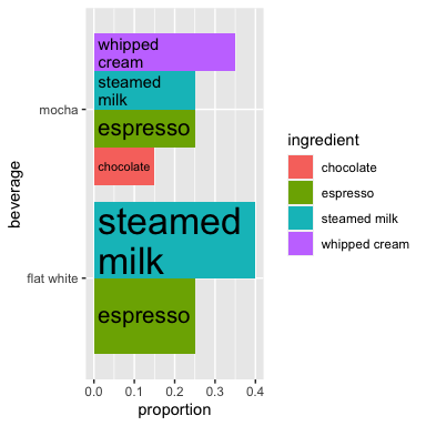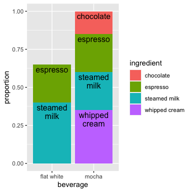 ggplot(beverages, aes(x = beverage, y = proportion, label = ingredient,