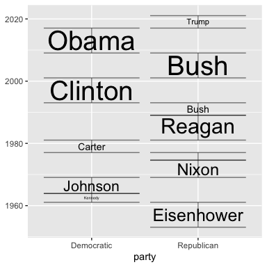 ggplot(presidential, aes(ymin = start, ymax = end, x = party, label = name)) +