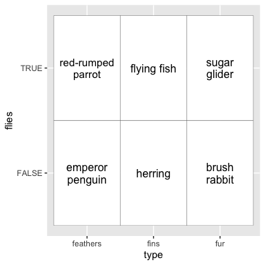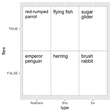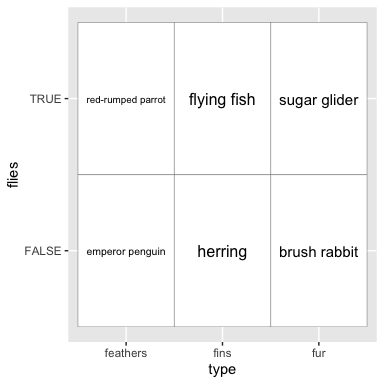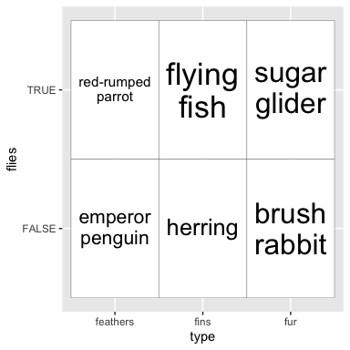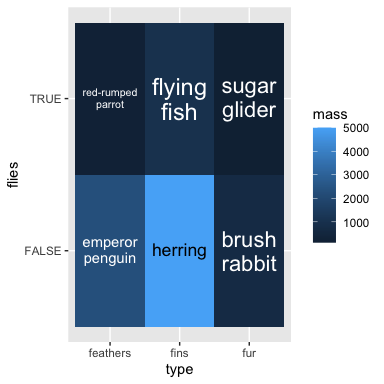 :ggplot(animals, aes(x = type, y = flies, fill = mass, label = animal)) +