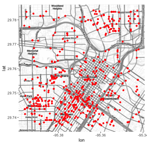 <- ggmap(map) + geom_point(data = robberies, color = "red")