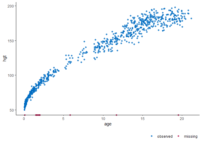 Inspect the missing data in an incomplete dataset and subsequently evaluate the imputed data points against observed data. See the Get started vignette for an overview of all functionalities. Example data from mice, showing height (in cm) by age (in years).