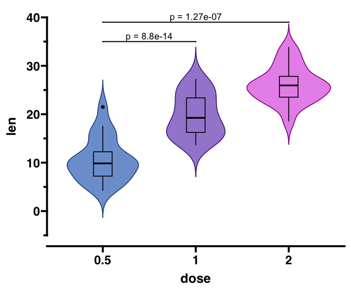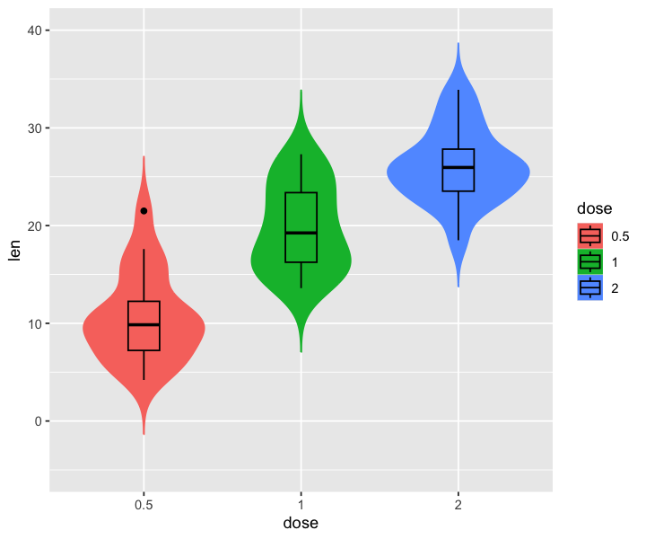 base geom_violin(aes(colour = dose, fill = dose), trim = FALSE) +