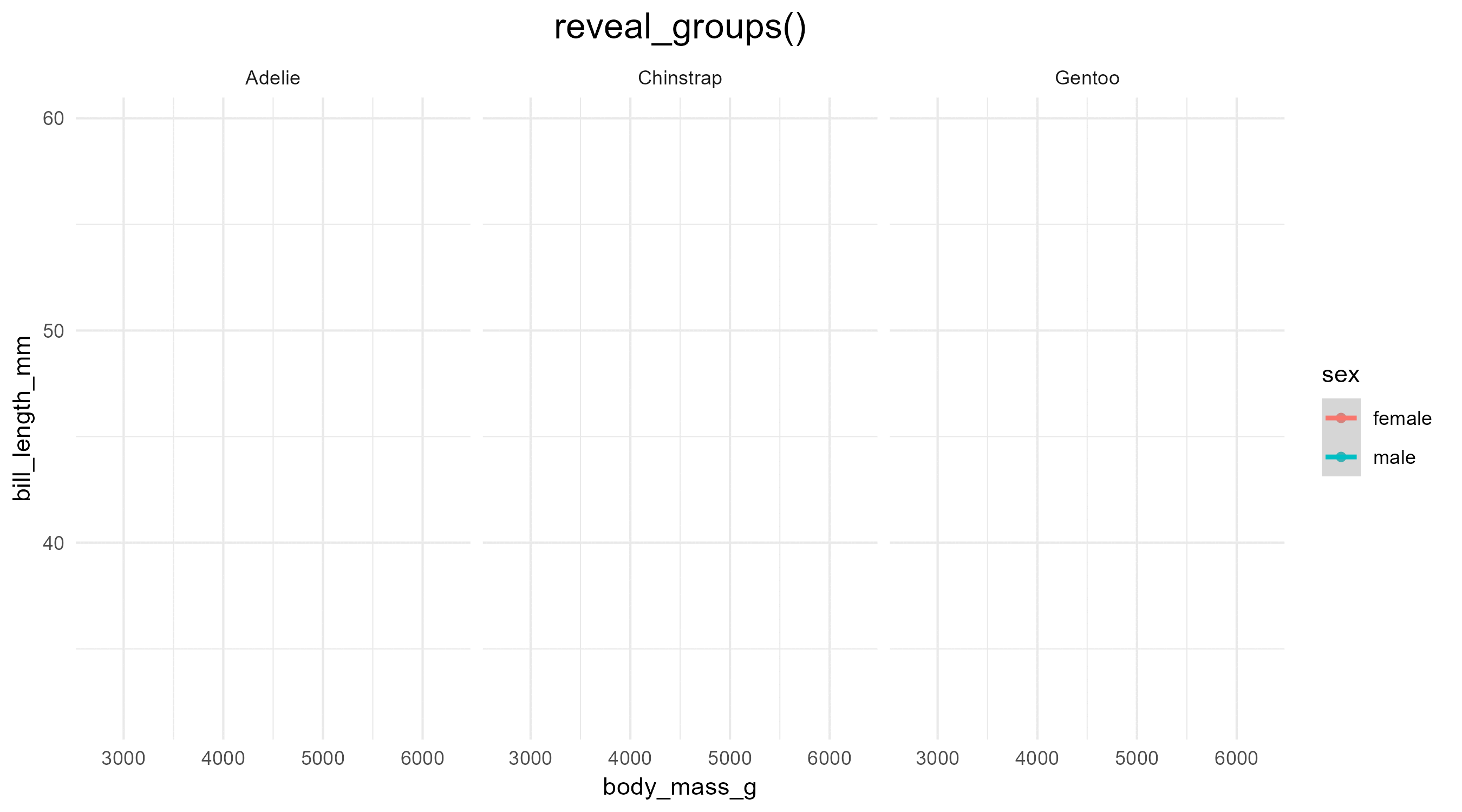 Then use one of the reveal_* functions (e.g. reveal_groups(), reveal_layers(), reveal_aes()) to obtain a list of plots that show elements incrementally.