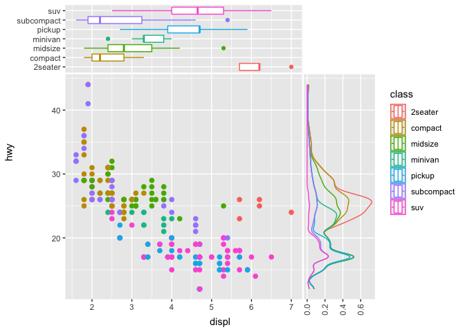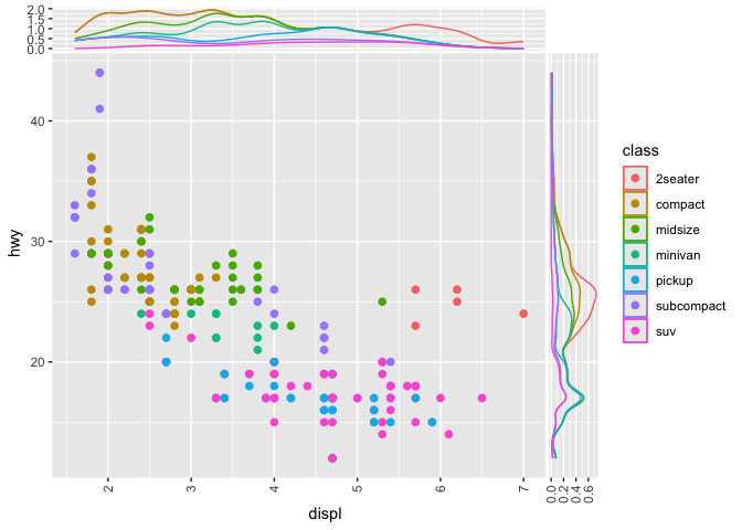 to a plot, then this places a density geometry in its own panel that is positioned by default above the main panel. This panel will share the same x axis of the main panel but will have an independent y axis. Take the following example from the ggplot2 readme.