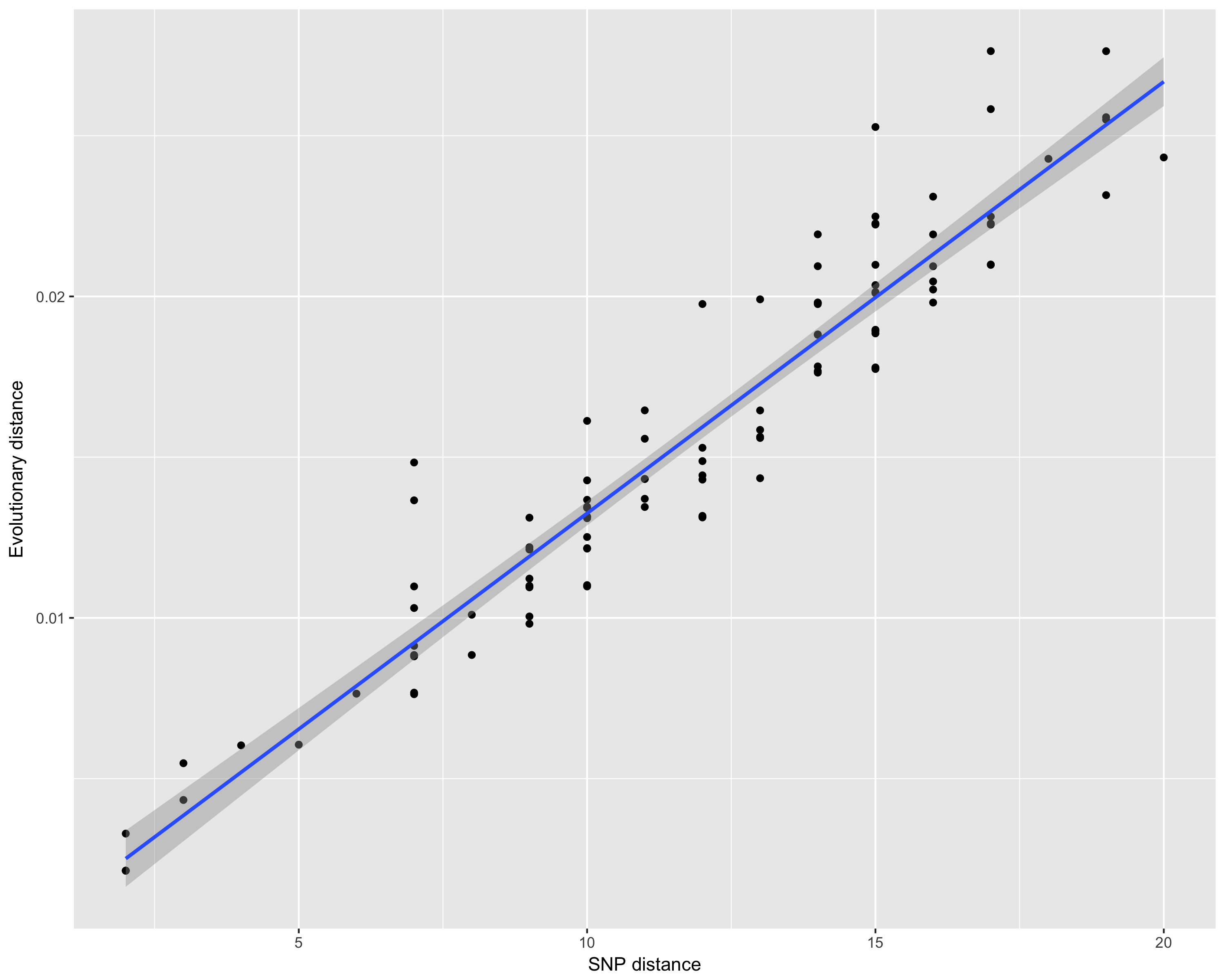 Assume you have a tree, and you want to understand what is the relationship between the branch lengths and the number of SNPs. The function dist_long can help you get there: