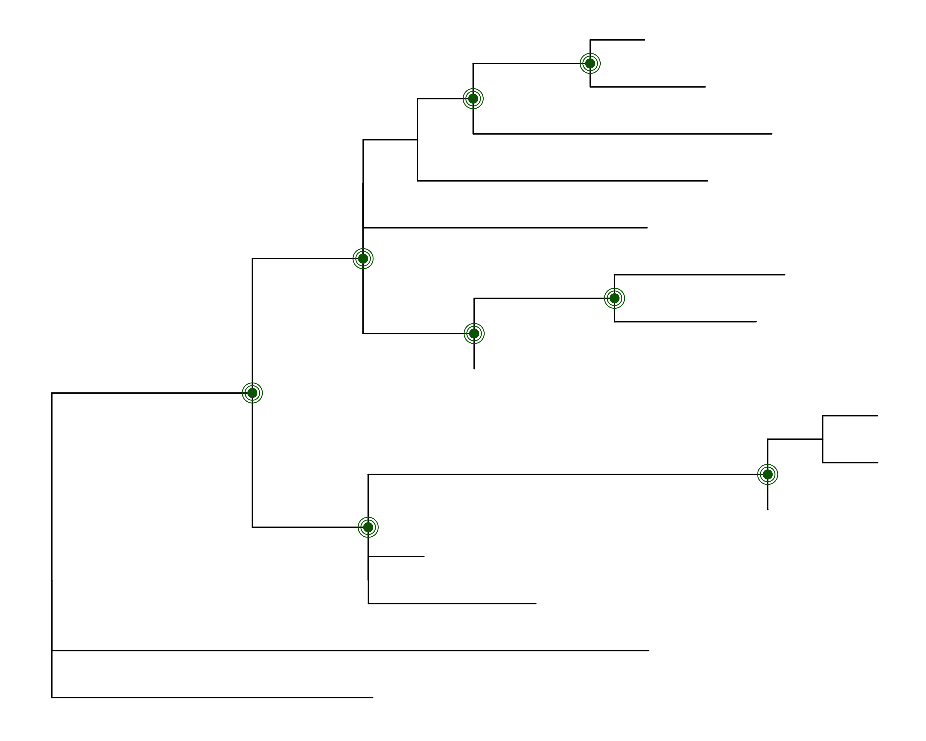 geom_point(data = node_support %>% dplyr::filter(`SH-aLRT` >= 50 & uBS >= 50), aes(x = x, y = y), colour = 'darkgreen', size = 7, pch = 21)