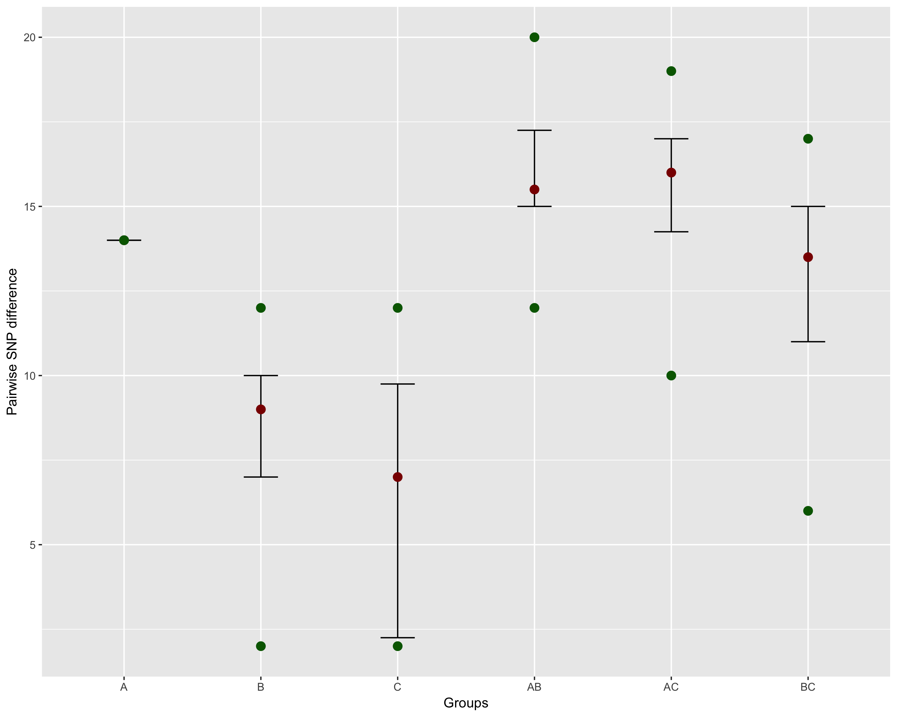 Assume you have classified your samples into different groups (say A, B, and C). These could be anything (e.g., MLST, sample source, host, etc.), and you want summary information among and between the groups (e.g., IQR, min/max dist). You can use dist_long and add_metadata to generate the data.frame you need: