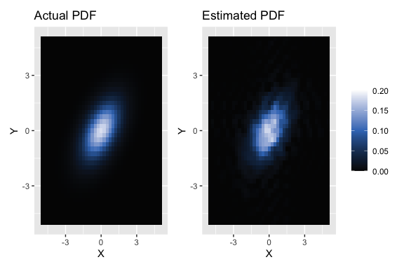 The aforementioned suitability of Hermite series based estimators in sequential and one-pass batch estimation settings extends to the bivariate case. Probability densities and cumulative probabilities can be obtained at arbitrary points. The syntax to calculate probability densities and