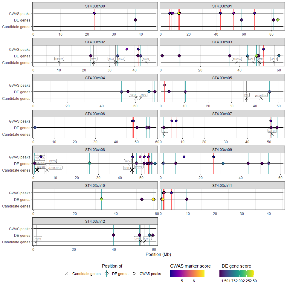 it displays the position of the significant markers and genes alongside candidate genes (HIDECAN plot). The plot can be customised by the user via a number of parameters (e.g. legend position or label size).