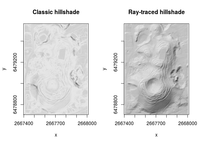 image(hs_hillshader, asp = 1, main = "Ray-traced hillshade", col = grey.colors(100))