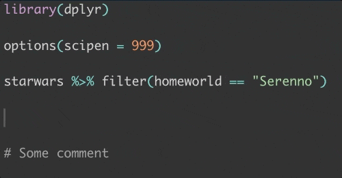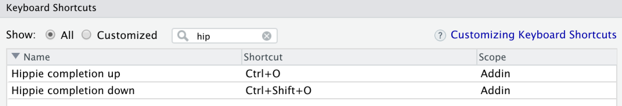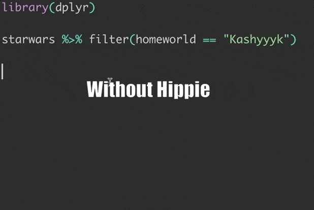 Hippie’s a completion engine that looks in your active source file for words to suggest. This differs from traditional completion in RStudio, which is more focused on using the R execution environment for identifying suggestions. Using both completion methods allows you to supercharge your RStudio experience.
