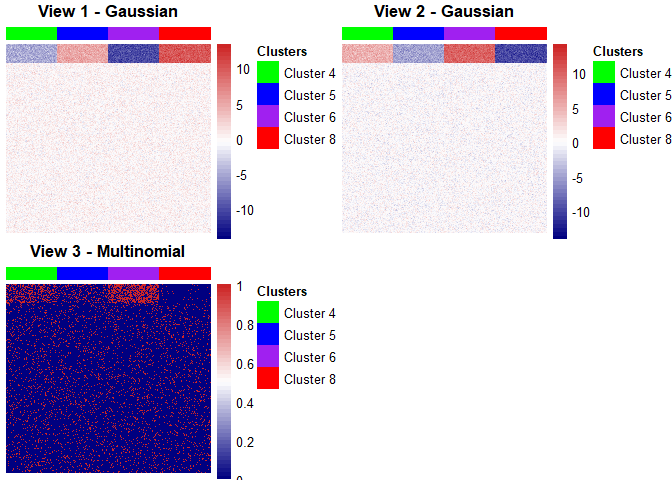using a simulated dataset comprising \(N = 240\) individuals and \(R = 4\) data views with different data