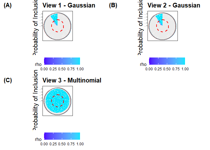 \pi_3 = 0.25, \pi_4 = 0.25\)). Each data view consisted of \(p_r = 500\) features (\(r = 1, \dots, 3\)), totaling \(p = \sum_{r=1}^3 p_r = 1500\) features