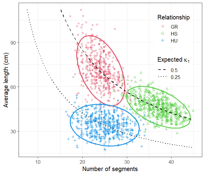 In this example we will compare the distributions of counts/lengths of IBD segments between the following pairwise relationships: