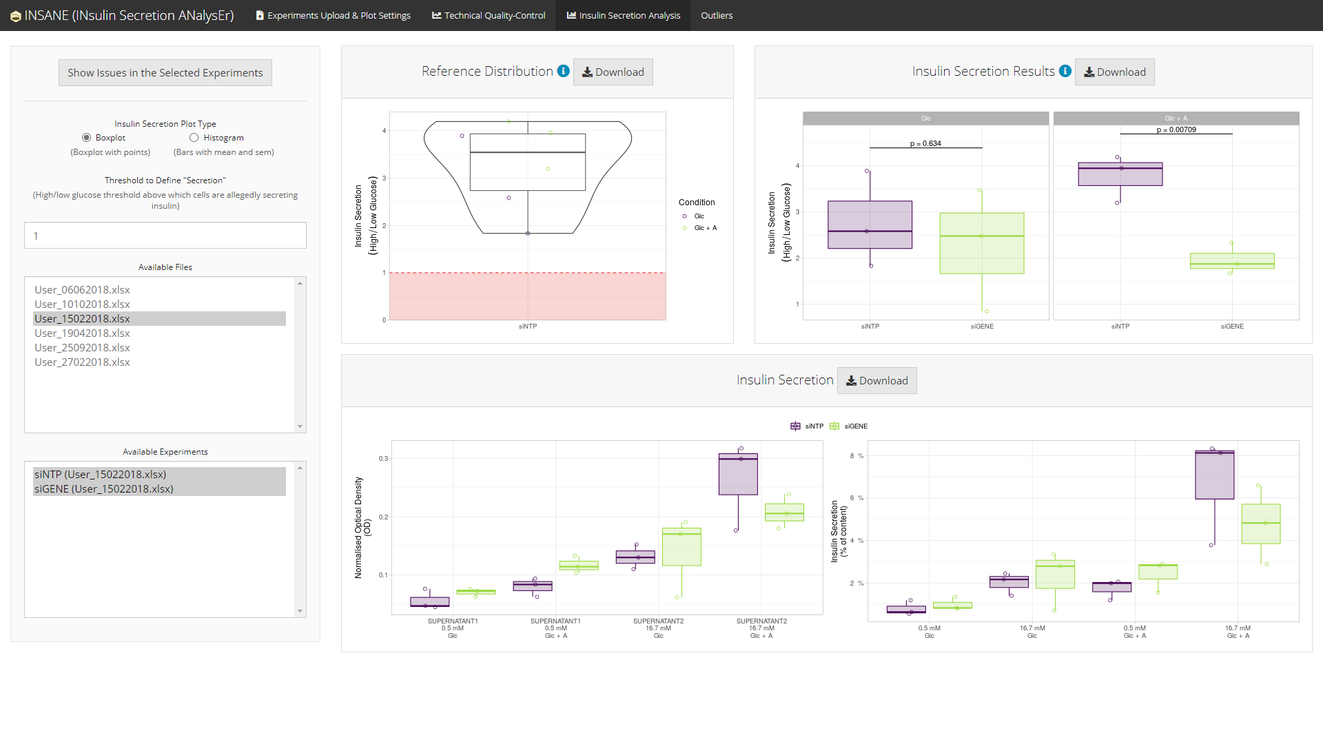 insane performs statistical analyses of the experimental conditions, e.g., one silenced gene (siGENE) compared to an insulin secretion reference (siNTP) in two stimulation conditions (Glc and Glc + A).