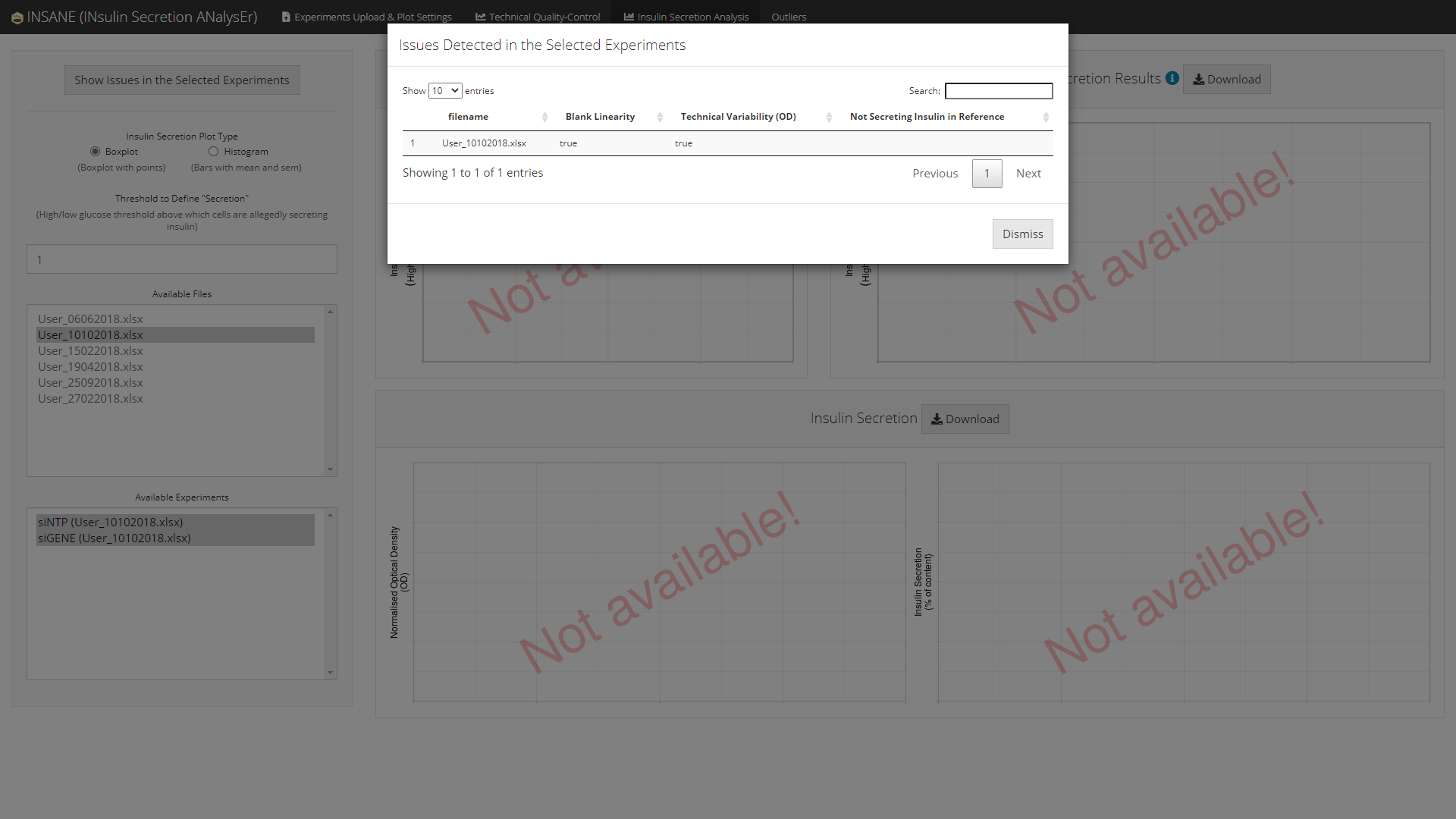 If and when some experiments are failing any of the technical quality-controls, a summary of the issues regarding the selected experiments can be displayed using the button Show Issues in the Selected Experiments