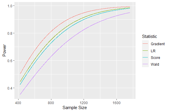Here we see that the gradient statistic would be the most efficient to test our hypothesis: We would need a sample size of 778 to reach our desired power.