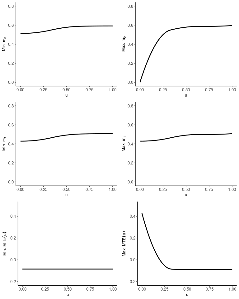 The ivmte package provides a flexible set of methods for conducting this extrapolation. The package uses the moment-based framework developed by @mogstadsantostorgovitsky2018e, which accommodates both point identification and partial identification (bounds), both parametric and nonparametric models, and allows the user to maintain additional shape constraints.