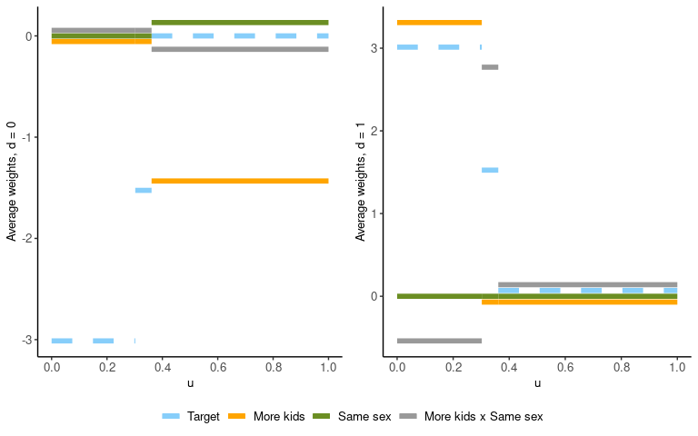 estimand with the same index.Adjusting for overlaps, the table above generates the plot below on the right. The analogous table containing the average untreated weights generates the plot on the left. For clarity, the weights for associated with the intercept have been omitted from both plots.