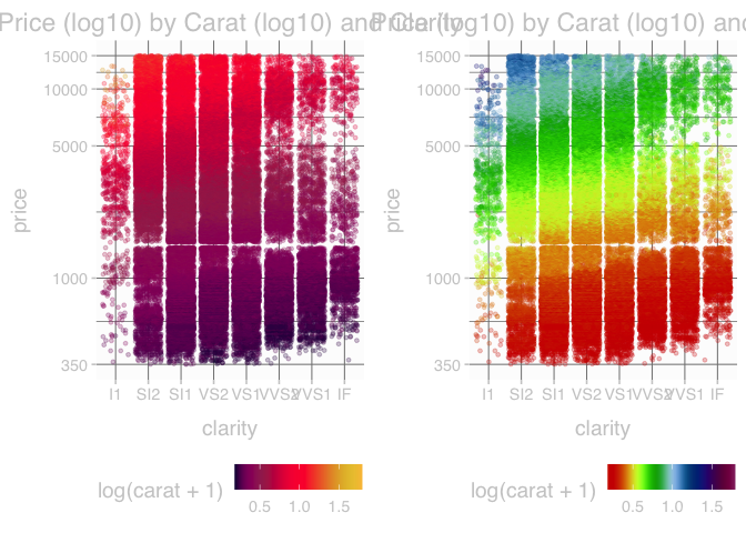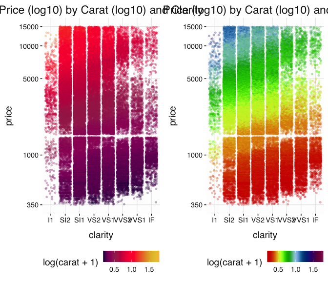 geom_point(alpha = 0.25, size = 1, position = "jitter", aes(color = log(carat + 1))) +