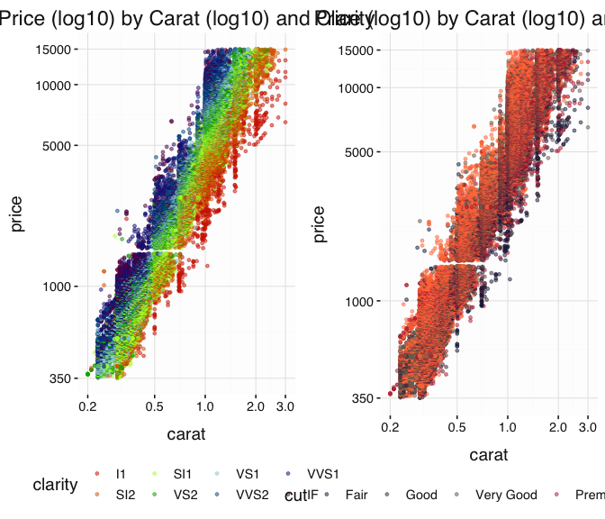 ggtitle('Price (log10) by Carat (log10) and Cut') +