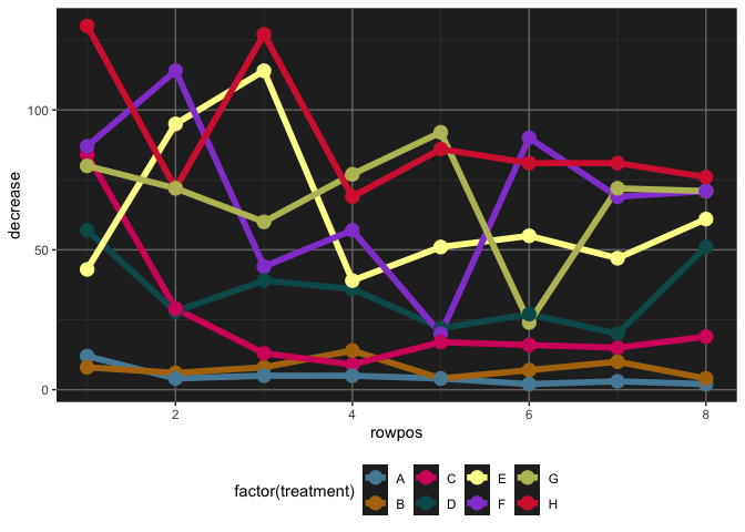 pltd <- ggplot(data = OrchardSprays, aes(x = rowpos, y = decrease,