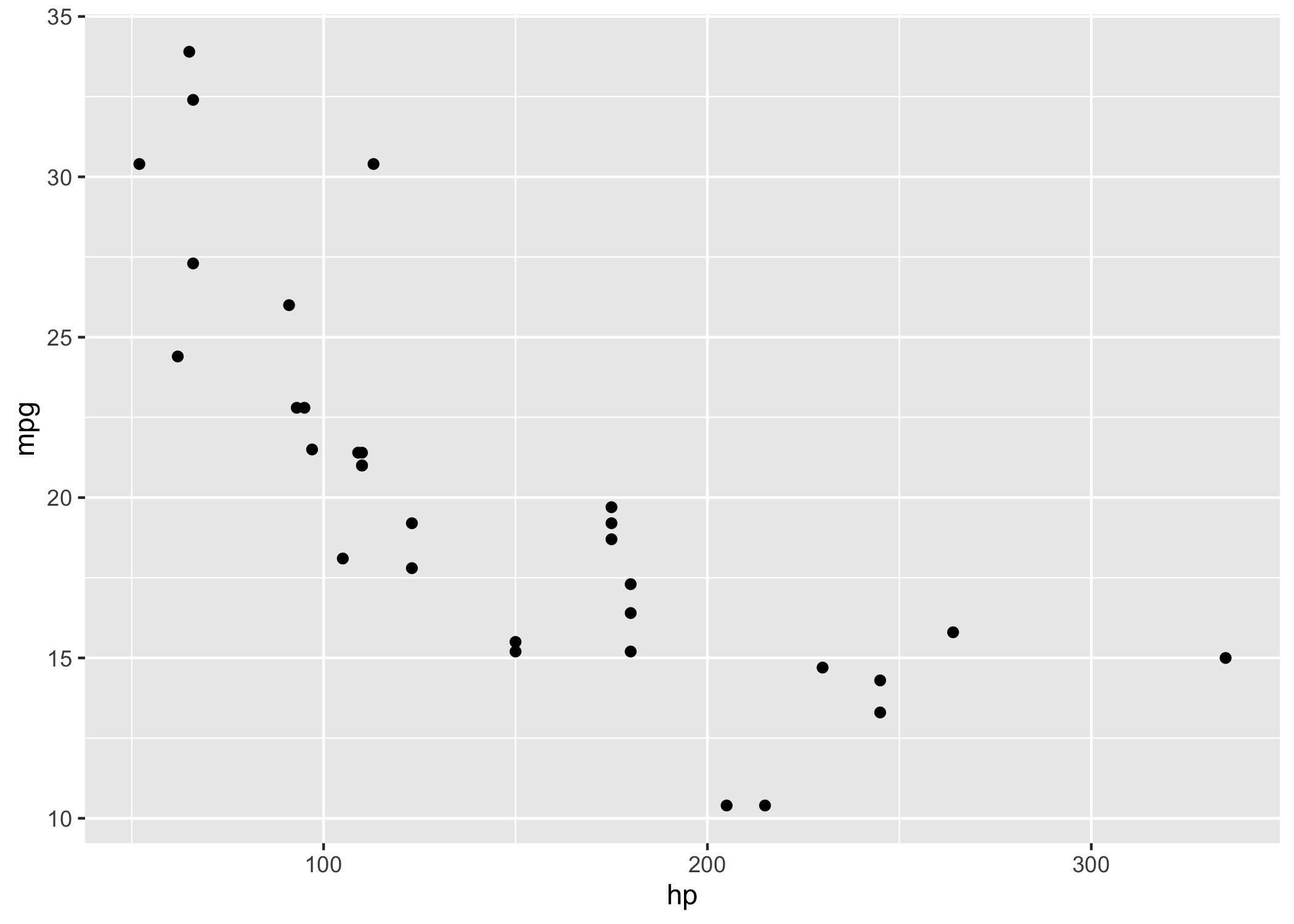 {::ggplot(mtcars, ggplot2::aes(x = hp, y = mpg)) +