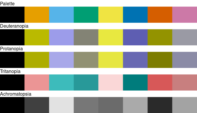 This R package provides an implementation of Okabe and Ito (2008), Tol (2021) and Crameri (2018) color schemes. These schemes are ready for each type of data (qualitative, diverging or sequential), with colors that are distinct for all people, including color-blind readers. This package also provides tools to simulate color-blindness and to test how well the colors of any palette are identifiable. To simulate color-blindness in production-ready R figures you may also be interested in the colorblindr package.