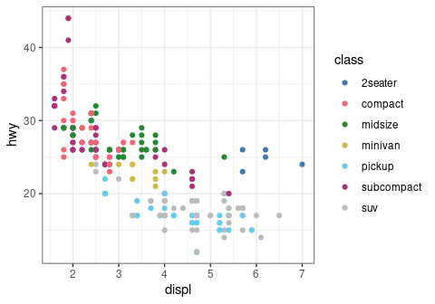 ggplot2::aes(x = displ, y = hwy, color = class) +