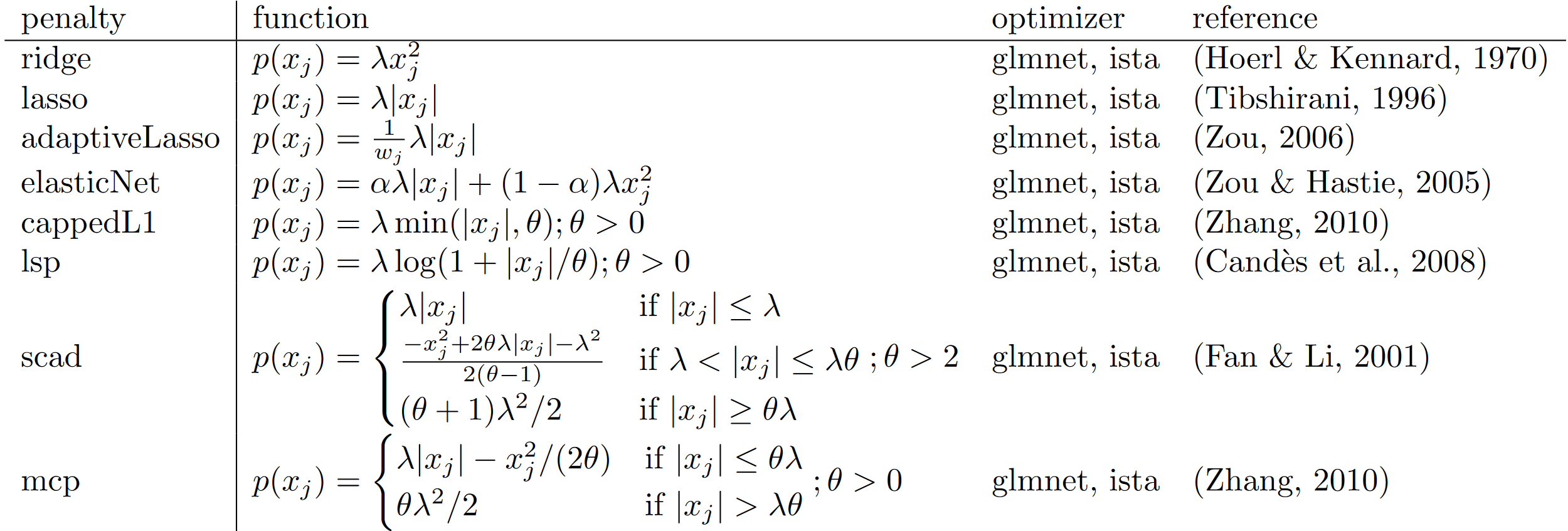 The column “penalty” refers to the name of the function call in the lessSEM package (e.g., lasso is called with the lasso()