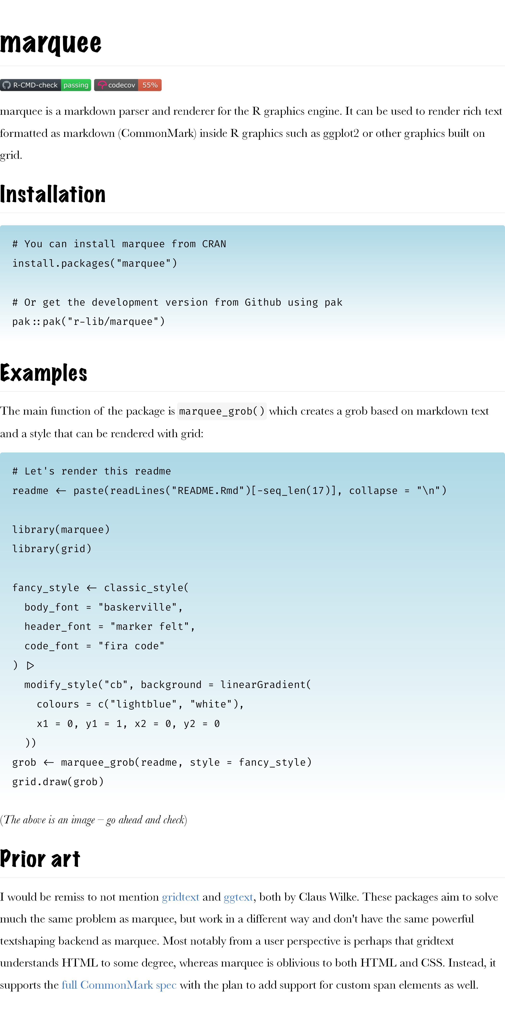 I would be remiss to not mention gridtext and ggtext, both by Claus Wilke. These packages aim to solve much the same problem as marquee, but work in a different way and don’t have the same powerful textshaping backend as marquee. Most notably from a user perspective is perhaps that gridtext understands HTML to some degree, whereas marquee is oblivious to both HTML and CSS. Instead, it supports the full CommonMark spec with the plan to add support for custom span elements as well.